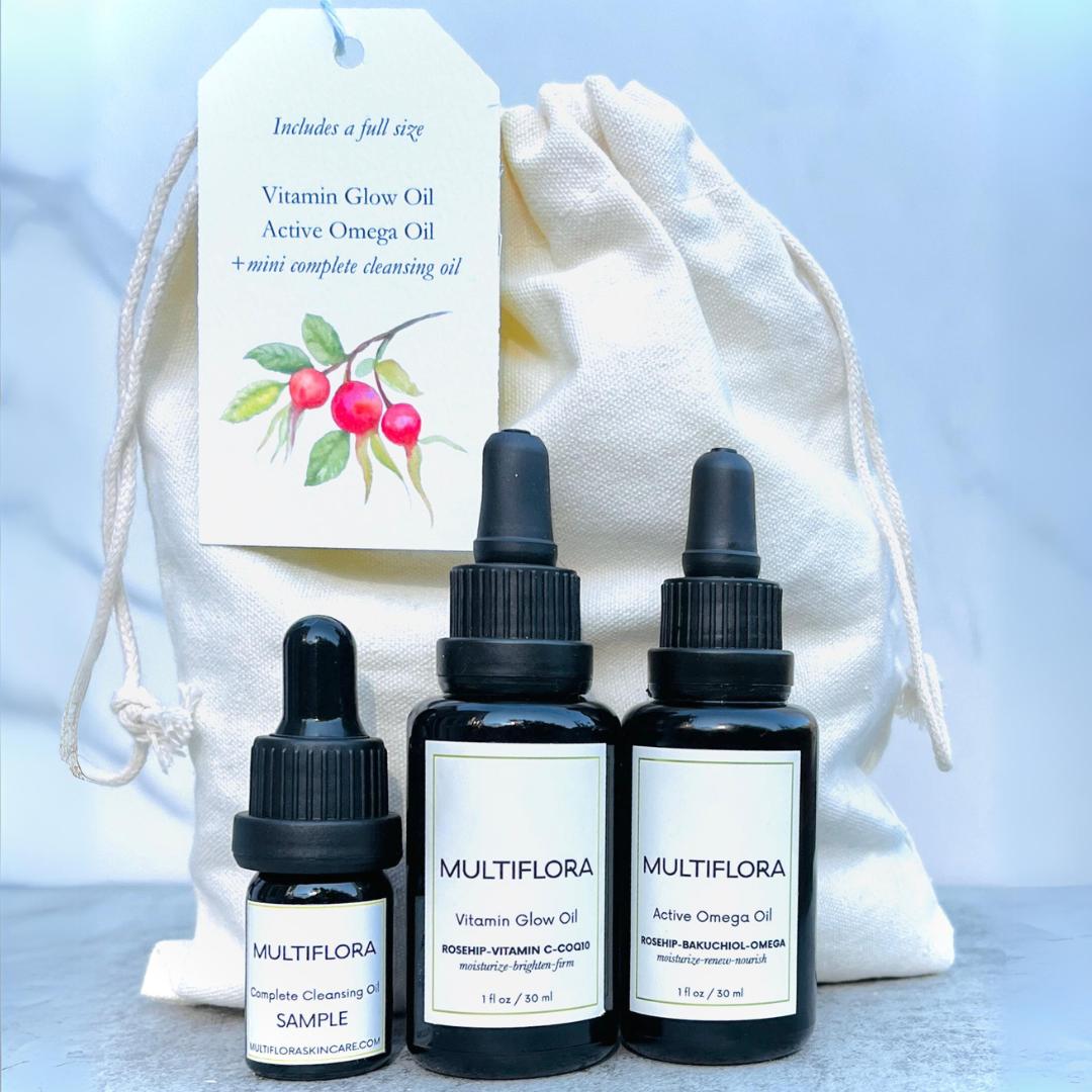 While we love rosehip oil on its own, we choose to pair this skin superfood with concentrated actives such as vitamin C and natural retinol alernative, bakuchiol. This way we can offer the best antioxidants for skin all in one product and allow our blends to be used as a face serum and moisturizer in one. Your skin will have an immediate glow as well as long term benefits.